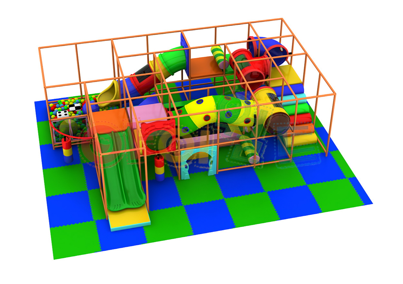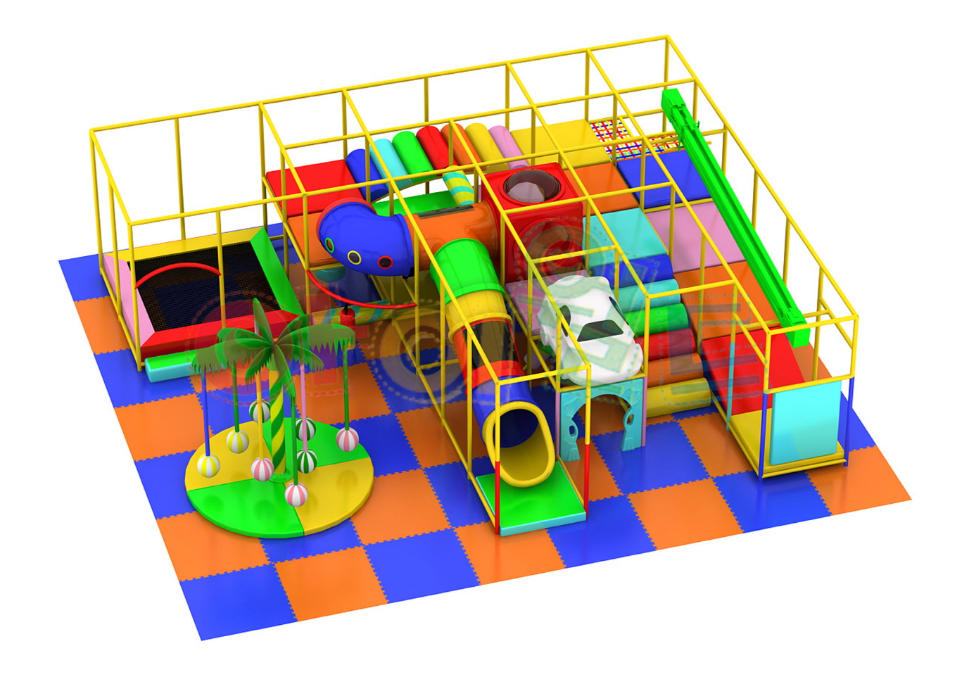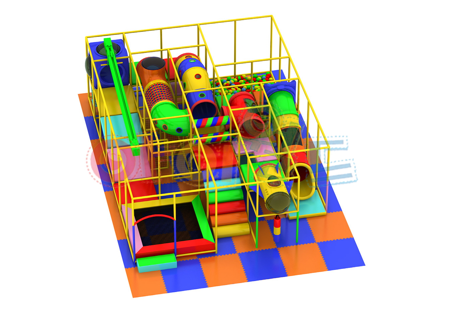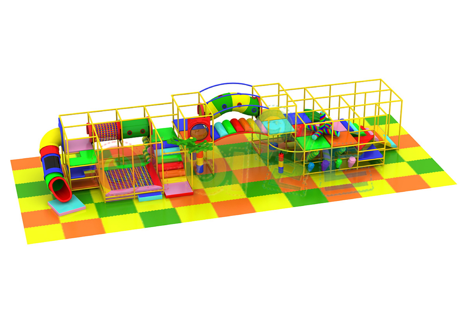 大型タイプ(iw-03-322) 製品番号:iw-03-322製品サイズ:長さ7000mm / 幅8100mm / 高さ2500mm設置面積:長さ7200mm / 幅9600mm / 高さ2600mm 室内遊具(全体)大型タイプ
