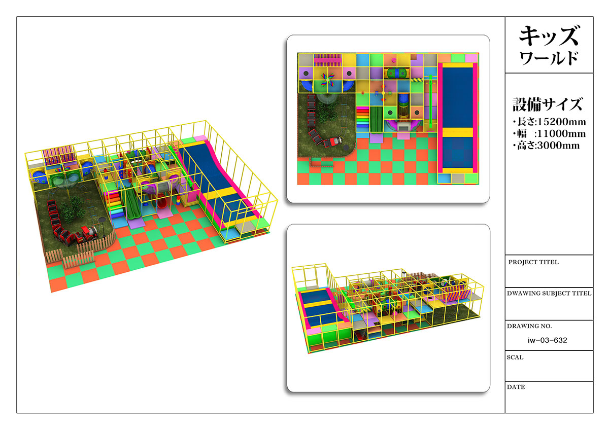 大型タイプ(iw-03-632) 2022.04.24 2022.03.18 製品番号:iw-03-632製品サイズ:長さ15000mm / 幅11600mm / 高さ3100mm設置面積:長さ15200mm / 幅11800mm / 高さ3200mm